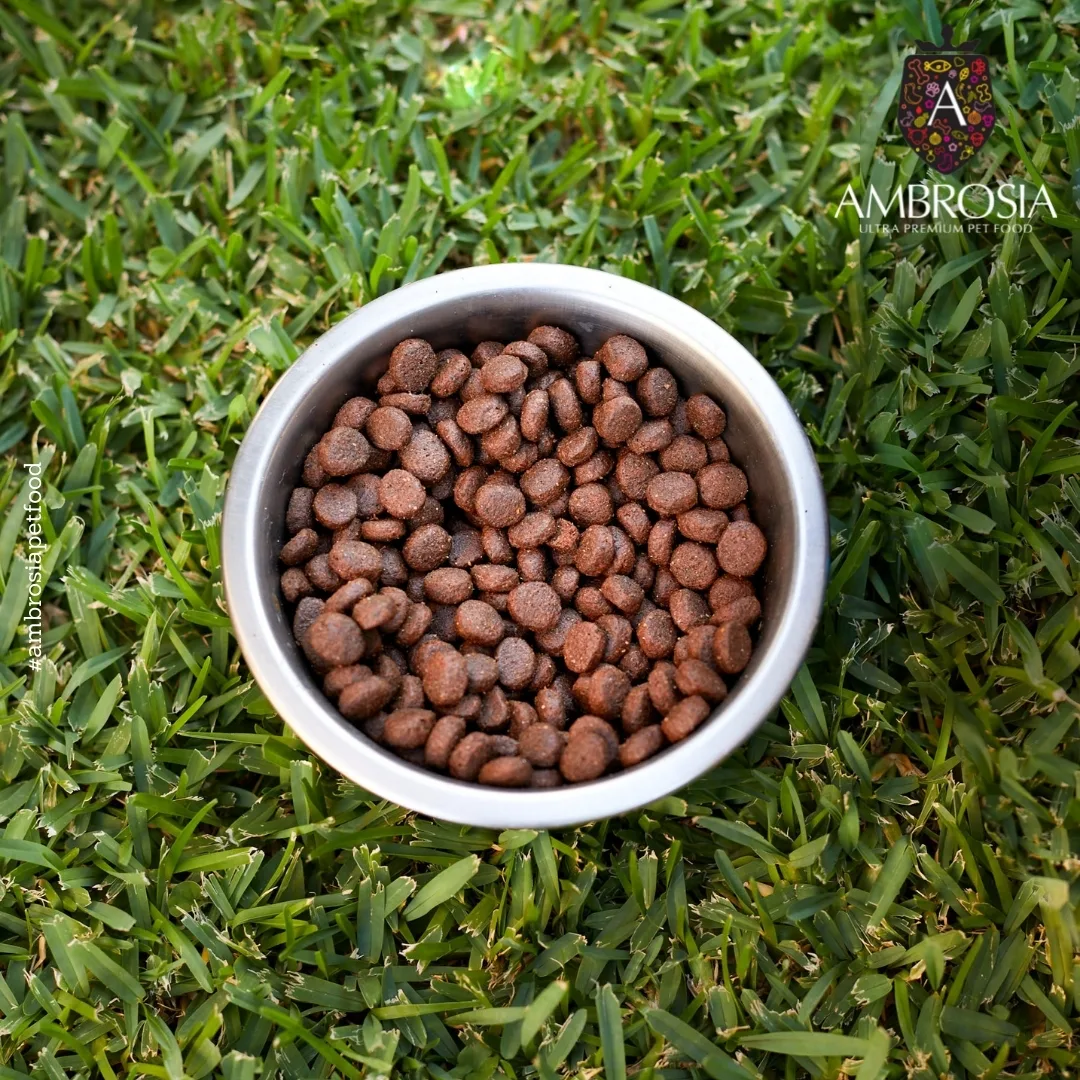 All BreedsAMBROSIA’s Beef & Fresh Salmon recipe combines easily digestible fish protein coming from fresh salmon fillets along with protein dense dehydrated beef. It also includes prebiotics and probiotics to improve digestion and the immune system, chondroitin and glucosamine to protect the joints and Taurine and L-Carnitine to enhance the cardiovascular and muscular system . Beef & Fresh Salmon recipe comes in a medium sized kibble ideal for all breeds of dogs.